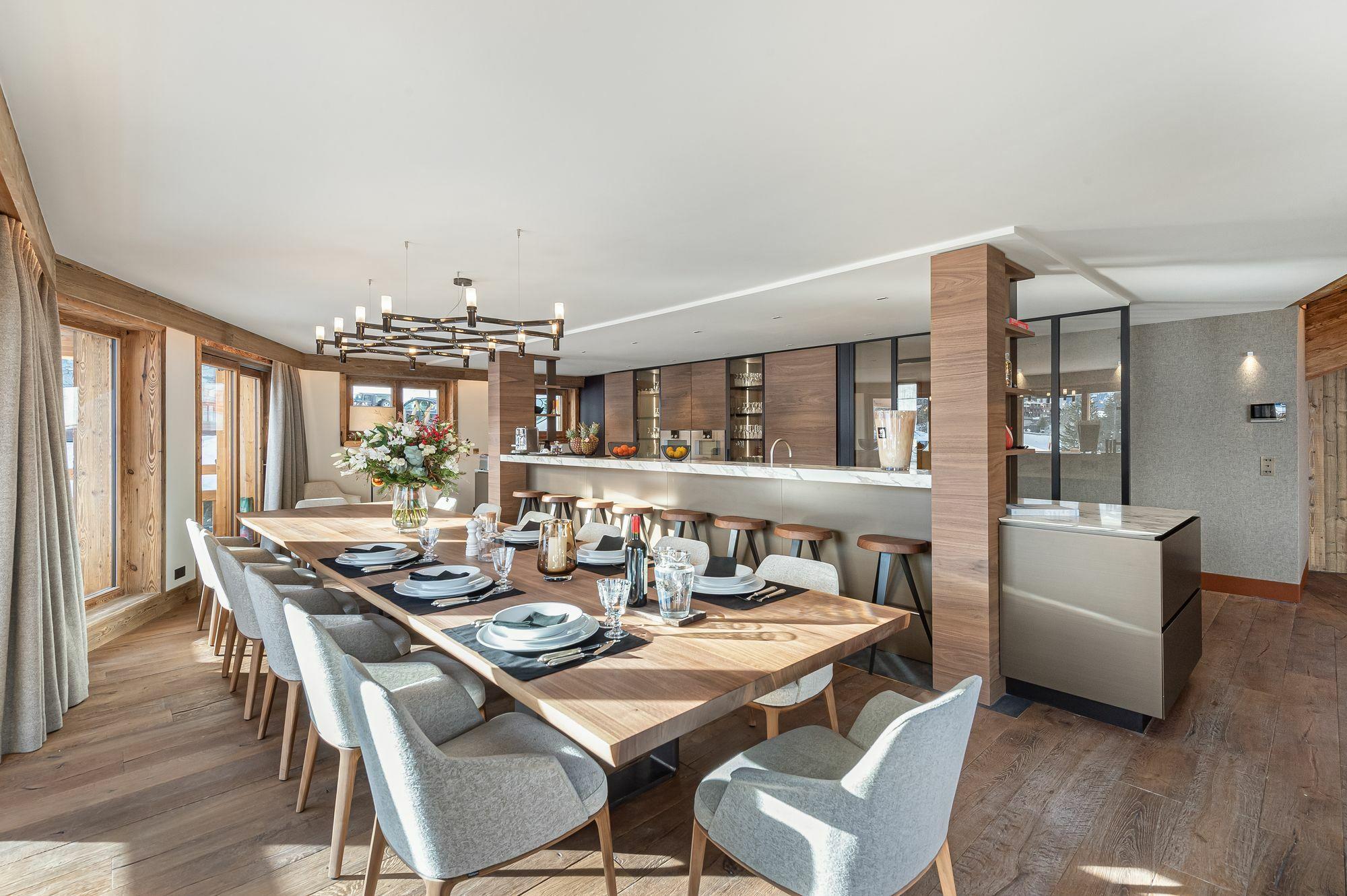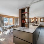 The perfect fusion between a typical alpine exterior and contemporary ambiance and decoration, the property offers on the ground floor a bright living room with a fully equipped kitchen, living room, and dining room with a balcony.