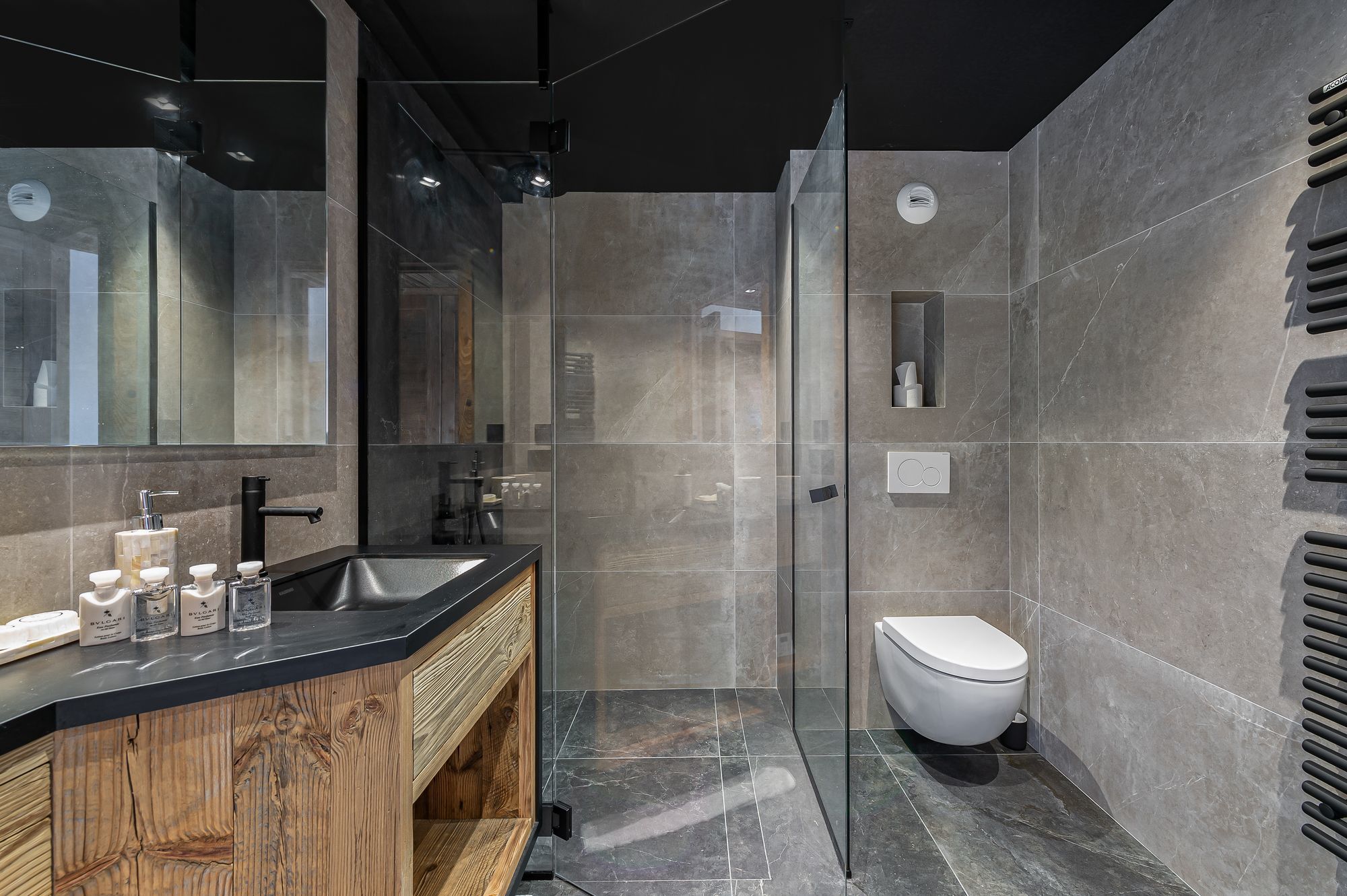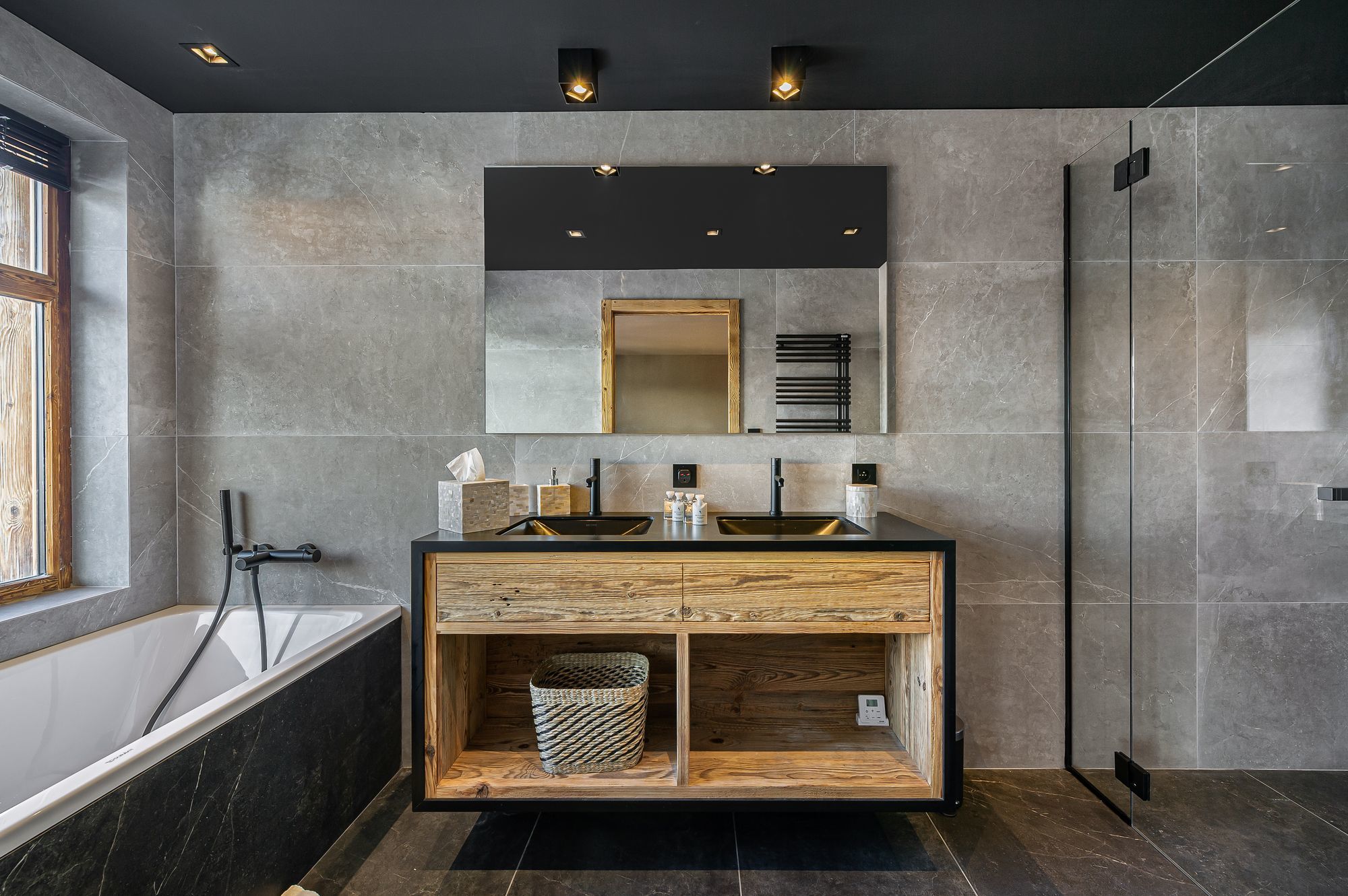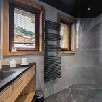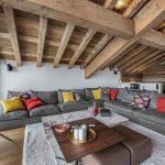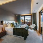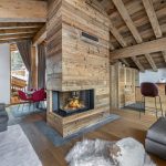 When you step inside the chalet’s living area, the high ceilings are quite impressive. In addition, the luxury chalet has carefully curated luxury furnishings with neutral tones and textures. There is an emphasis on wooden accents adding undoubtedly a warm and elegant atmosphere.
