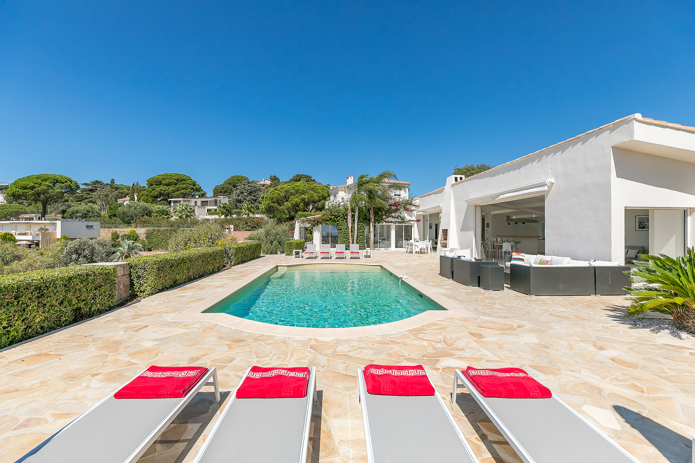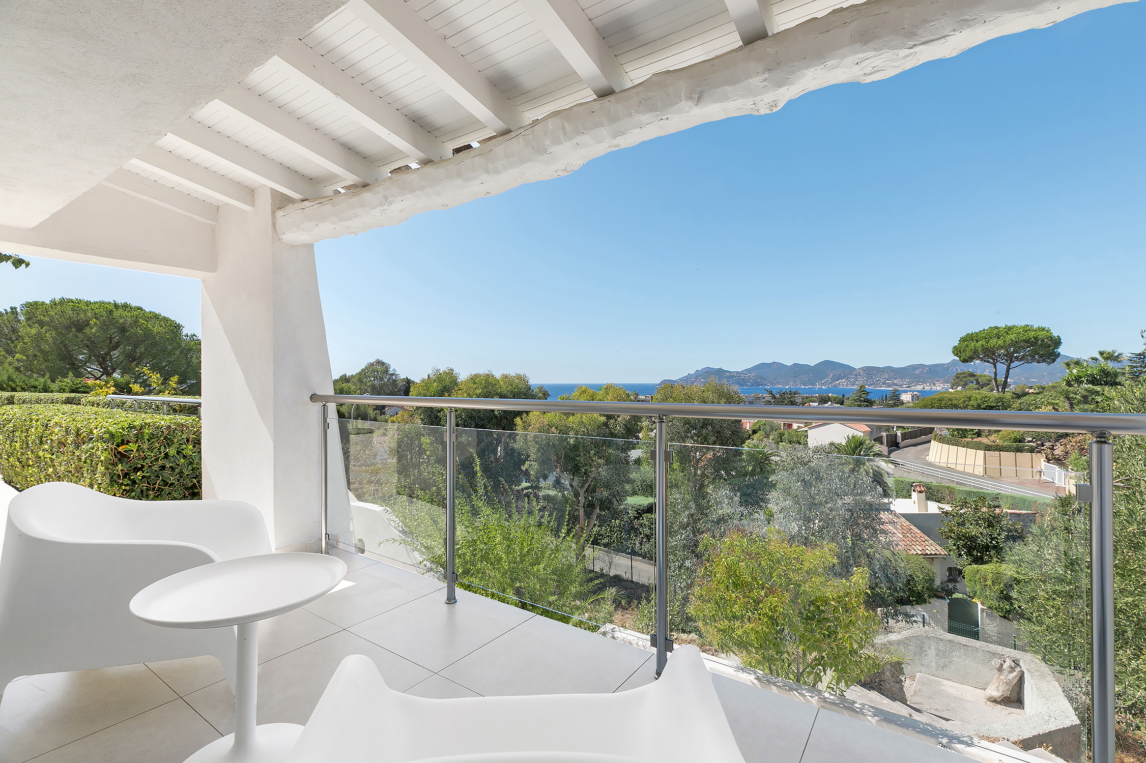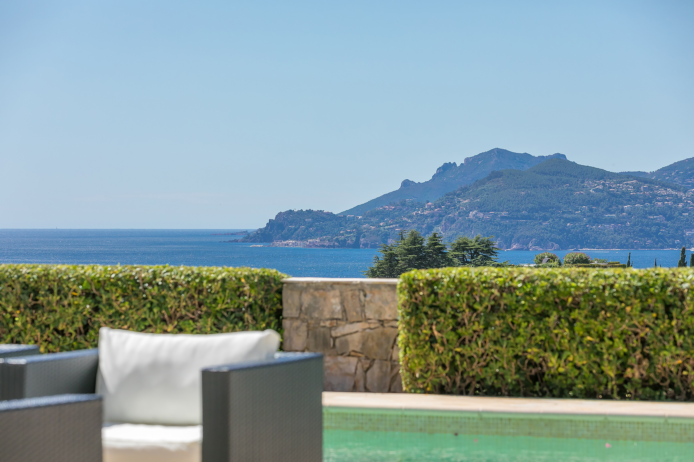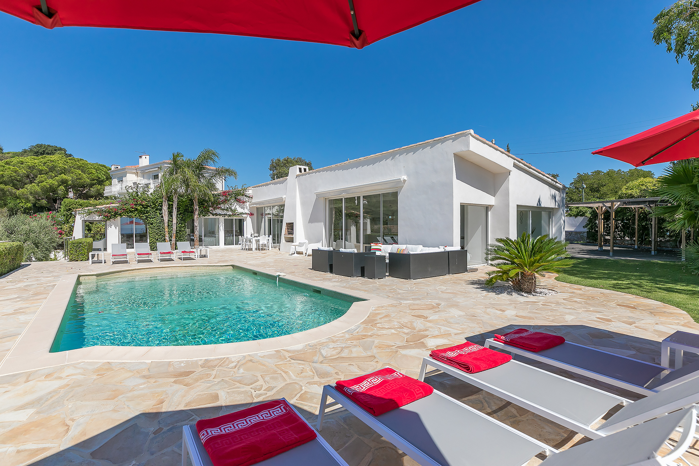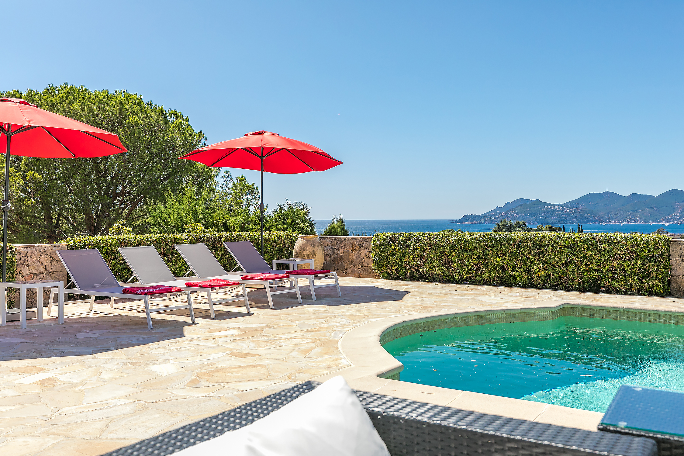 The villa has magnificent views over the Mediterranean and the Esterel mountains. The property is a haven of peace and tranquility for guests looking for a relaxing break in the sunshine of the Côte d’Azur. At the same time, it is perfectly placed to discover the golden beaches and vibrant nightlife of the glittering resort of Cannes, just 10 minutes down the coast.