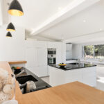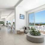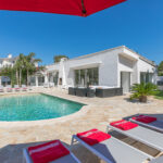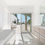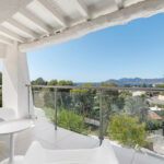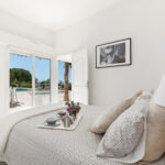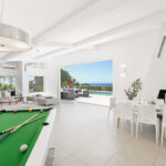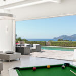 The villa has an elegant dining area, modern open-plan kitchen, laundry room, air conditioning, Wi-Fi, an open garage with space for 6 cars, plus additional closed garage, automated shutters, and a secure alarm system. The living spaces are decorated in crisp white and feature exposed beams and brickwork. The villa has a light and open living room with a large comfortable seating area with several elegant sofas, fireplace, and full-length windows that open directly onto the sunny patio. The villa has a fully-equipped modern kitchen, all decorated in the same neutral tones as the main living space.