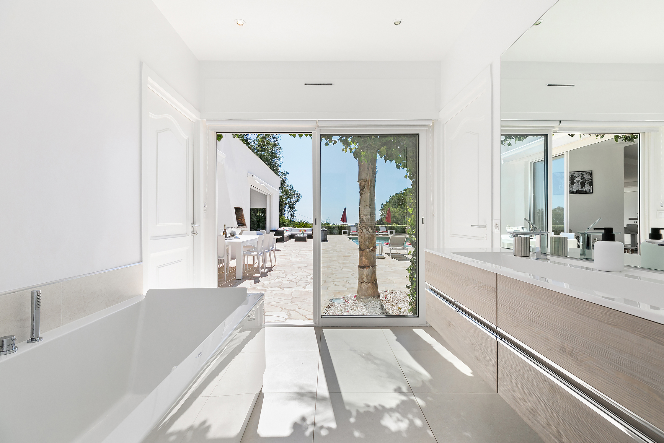 The villa is set in a lovely garden surrounded by lush greenery and several towering palm trees. The main living space opens directly onto a large sunny terrace, featuring a summer living room with contemporary outdoor lighting, and BBQ area.