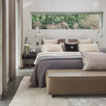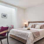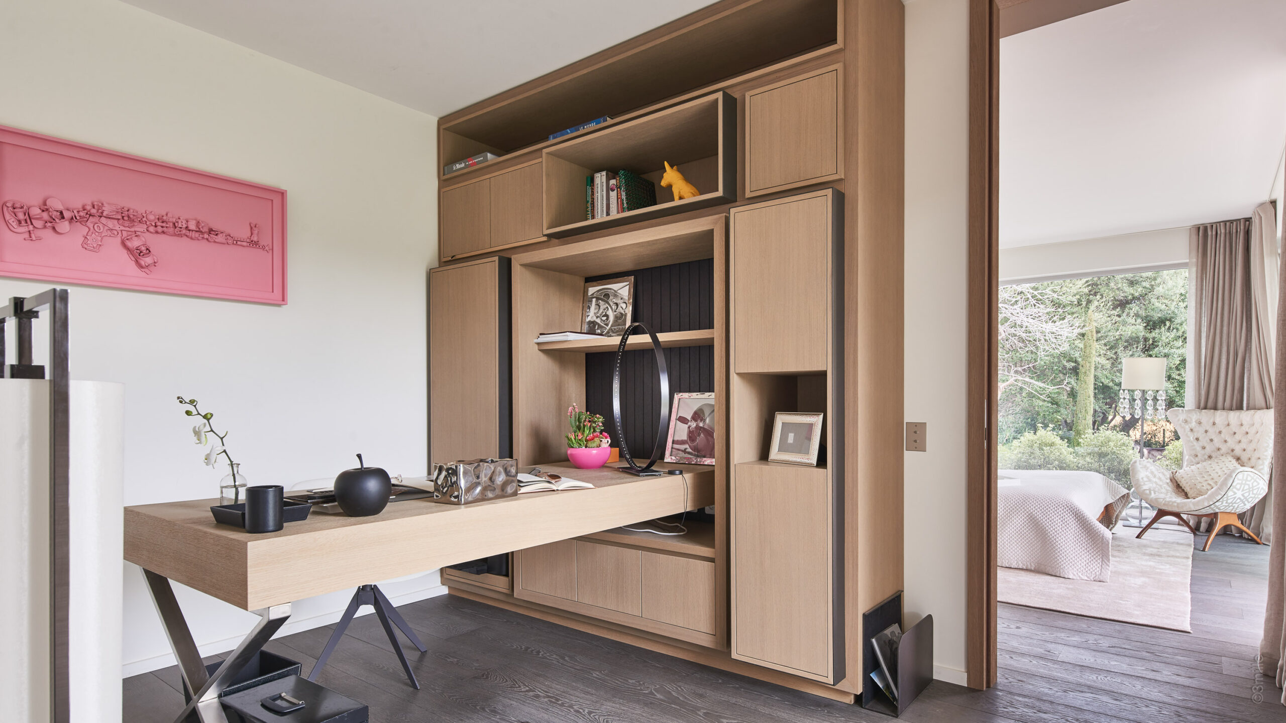 The villa features two spacious master bedrooms overlooking the pool and garden, with marble bathrooms and large dressing rooms. Additionally, there is a child’s bedroom with a dressing room, marble shower room, sink, and toilet. This floor features a superb room with a huge minimalist bay window that opens entirely in a brick partition, extending onto a wooden terrace of 70 square meters.