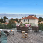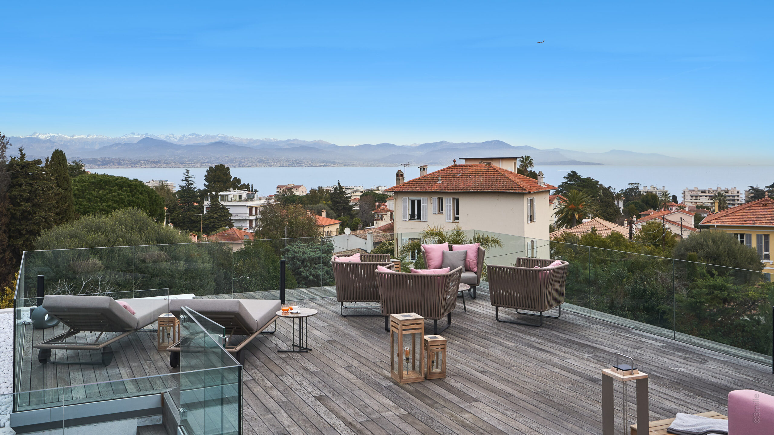 The villa also boasts a roof terrace of 100 square meters, accessible via a beautiful wooden staircase. The roof terrace offers an exceptional panorama of the sea view to the Italian coast, overlooking Nice, Cap Ferrat, and the lighthouse of Cap d’Antibes. The villa’s lower level features a piano area, wine cellars, a spacious fifth room with a skylight and high ceilings, a dressing room, a separate toilet, a bathroom with a basin, and thalassotherapy baths. There is also a beautiful design sauna made entirely of glass for four people, along with a stone shower and two beds to relax.