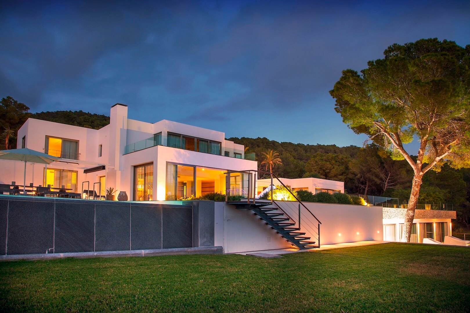 Nestled amongst over 80,000 square meters of the immaculate garden this villa is a perfect escape on the paradise island of Ibiza. The striking villa is an architectural wonder, while expansive sea views complete the incredible package on offer – and all close to the amenities of Ibiza Town. In total the villa and adjoining guesthouse offer 7 bedrooms allowing up to 14 guests to sleep comfortably.