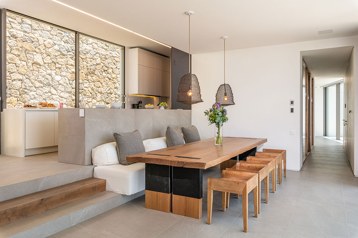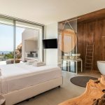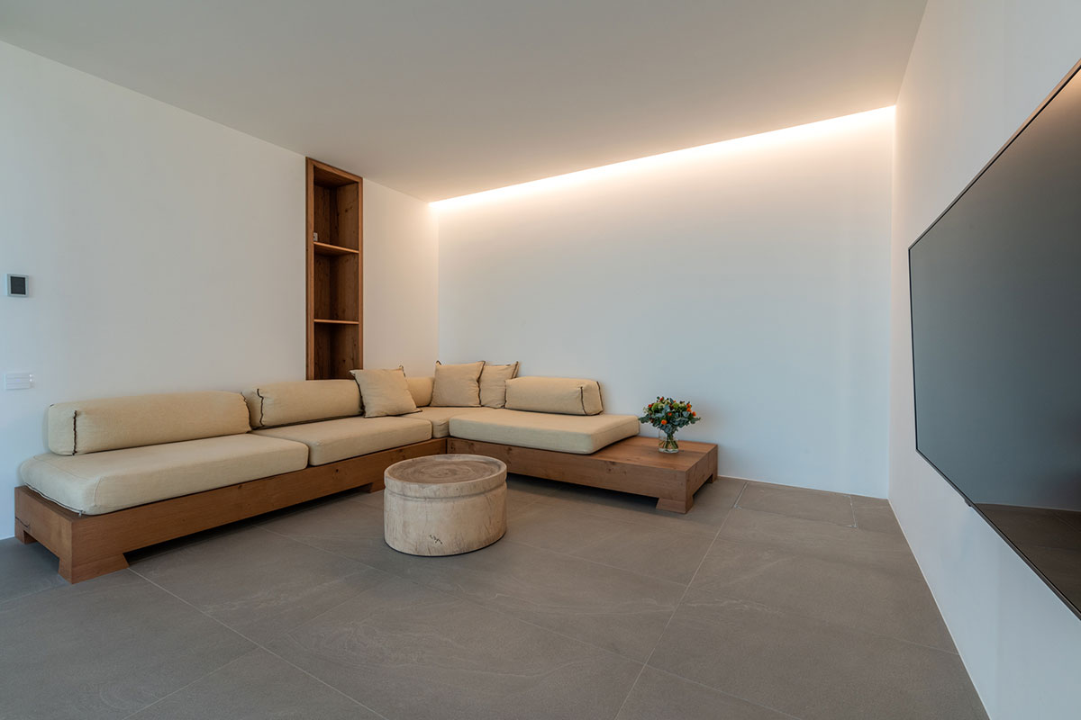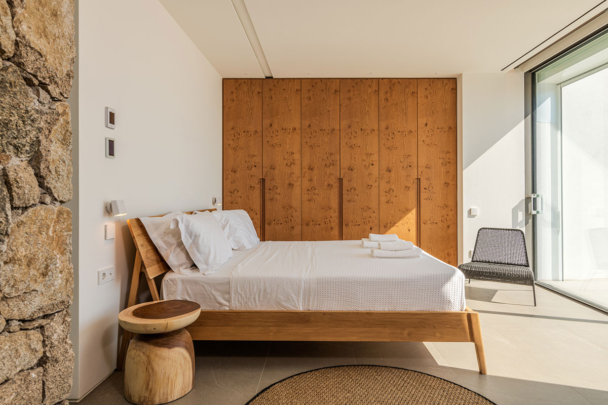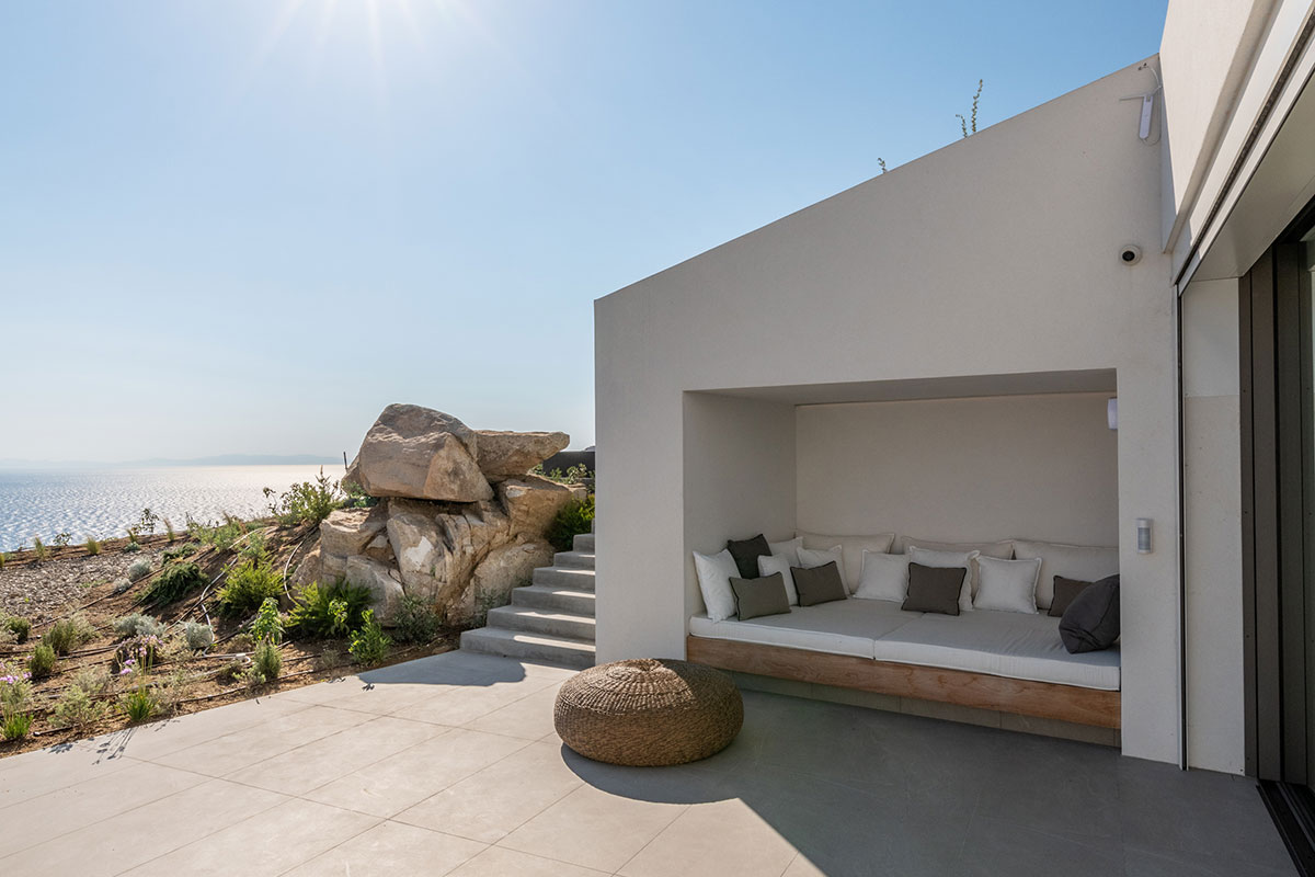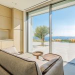 The interior is a peaceful sanctuary, with soft neutral colors and natural textures throughout. Another highlight of the design is the floor-to-ceiling windows that offer sumptuous views over the sea.