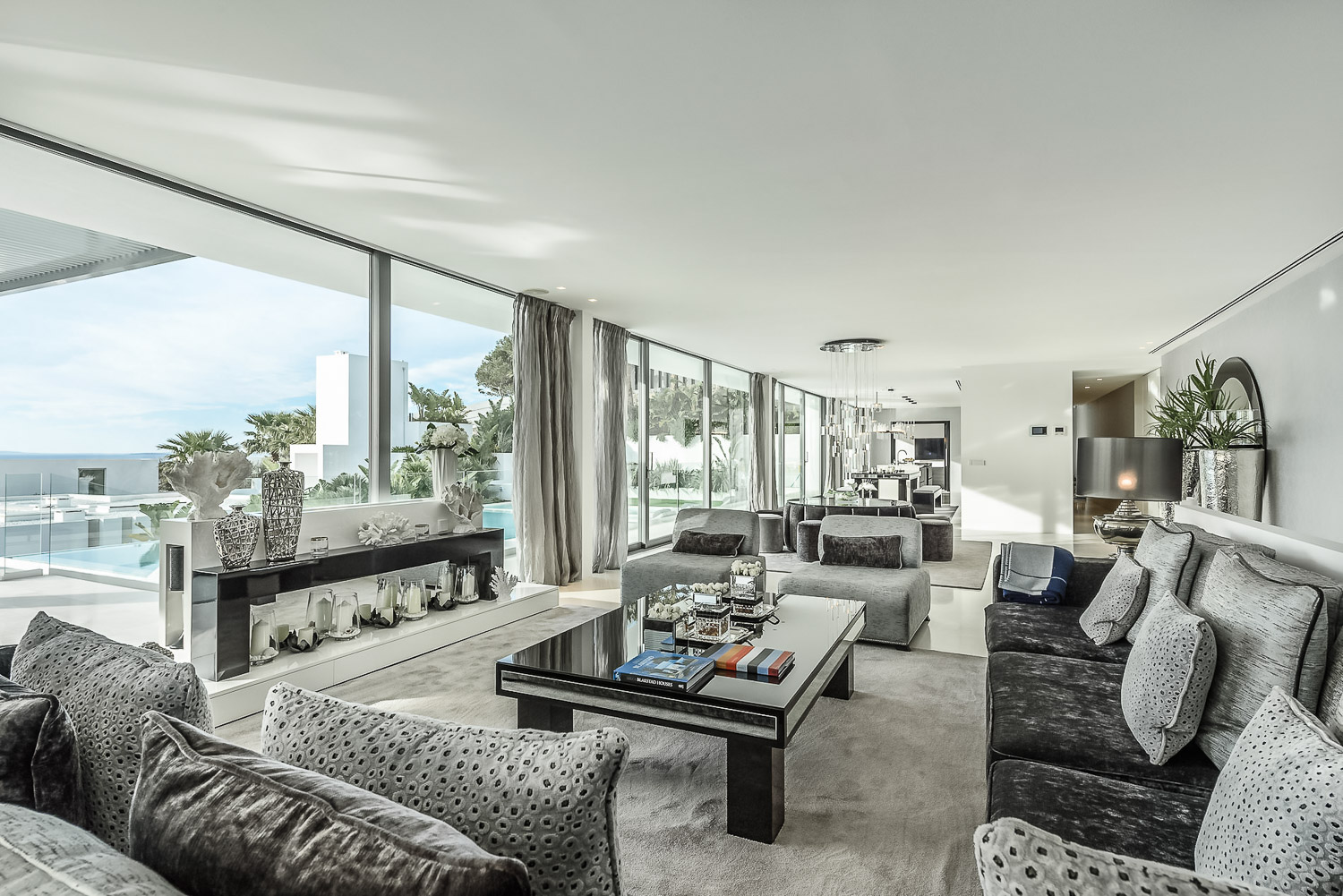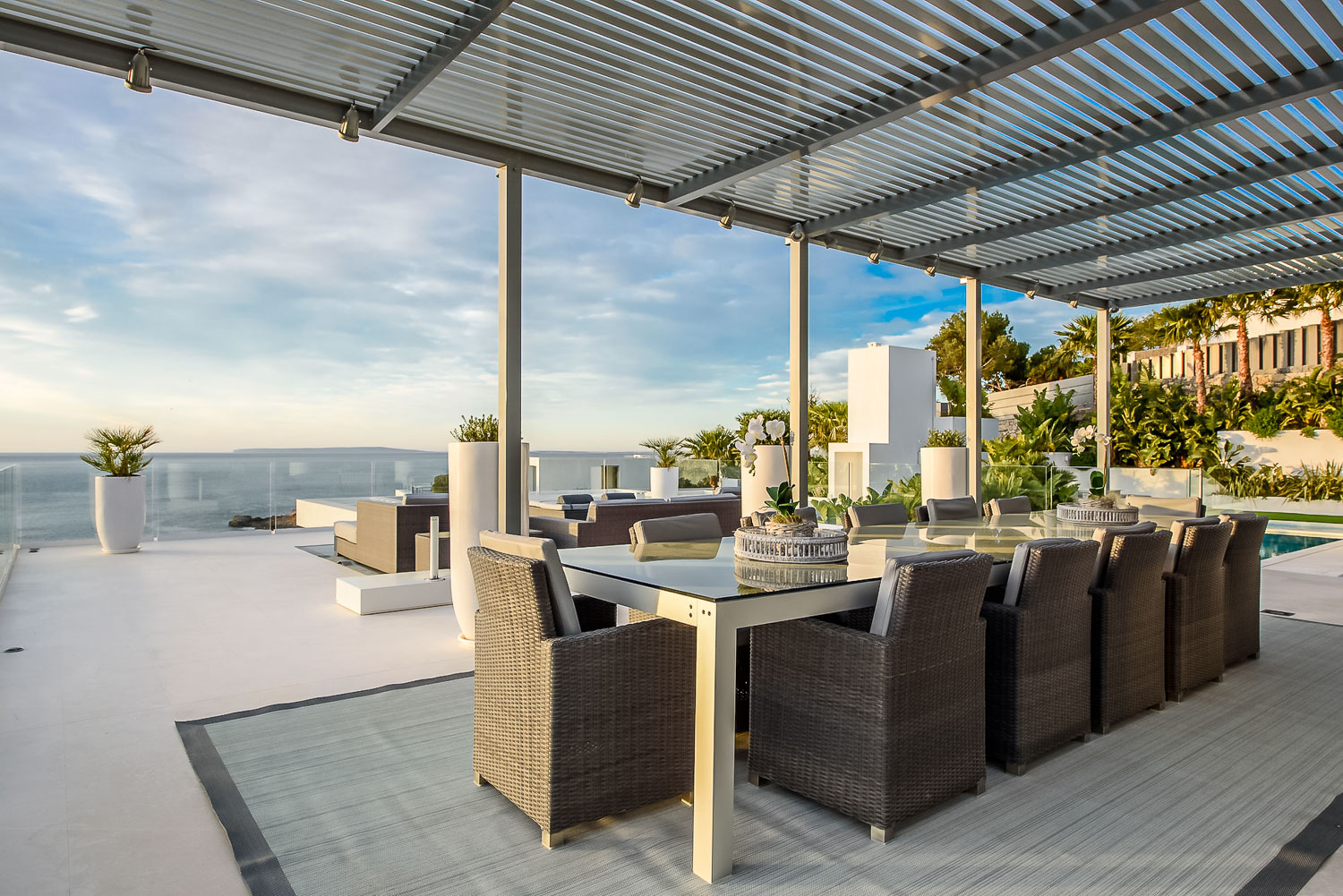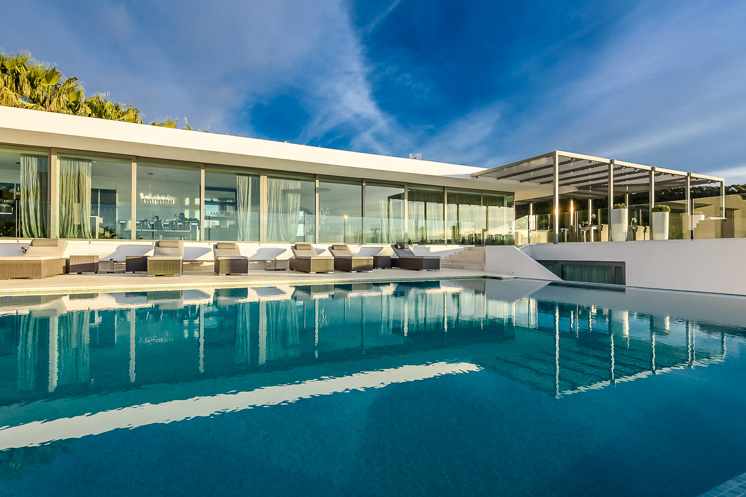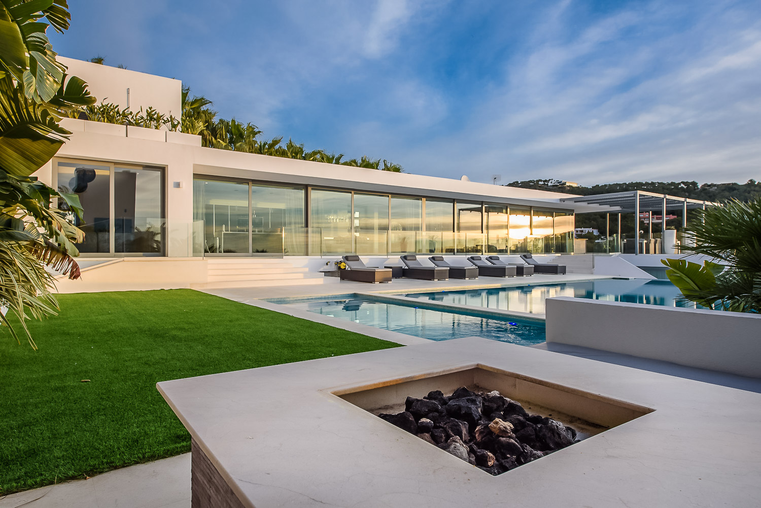 Villa Flora is a stunning luxury villa in Ibiza. This exquisite property is a contemporary masterpiece. It is sleek and sophisticated and blends beautifully with the character of its surroundings. Nestled amongst mature palm trees, there is a sense of privacy and seclusion.