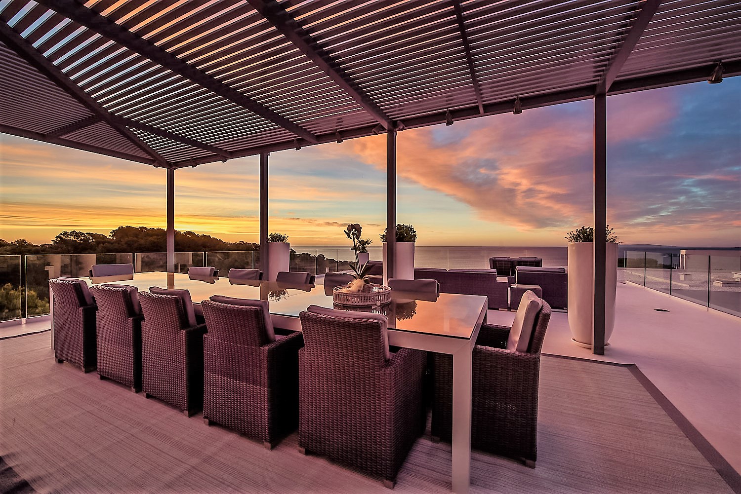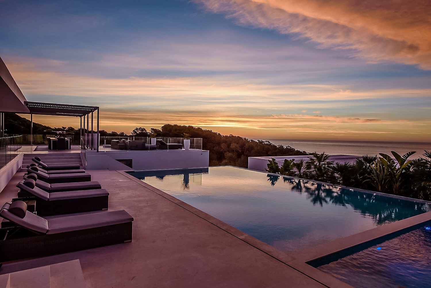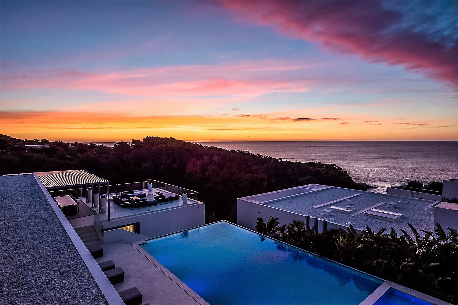 Outside, the large deck area is an entertainer’s paradise. It allows your guests to look over the sumptuous views and perhaps enjoy the dazzling infinity pool and jacuzzi. The rooftop terrace is another highlight of the property. From there, panoramic views are particularly beautiful at sunset.