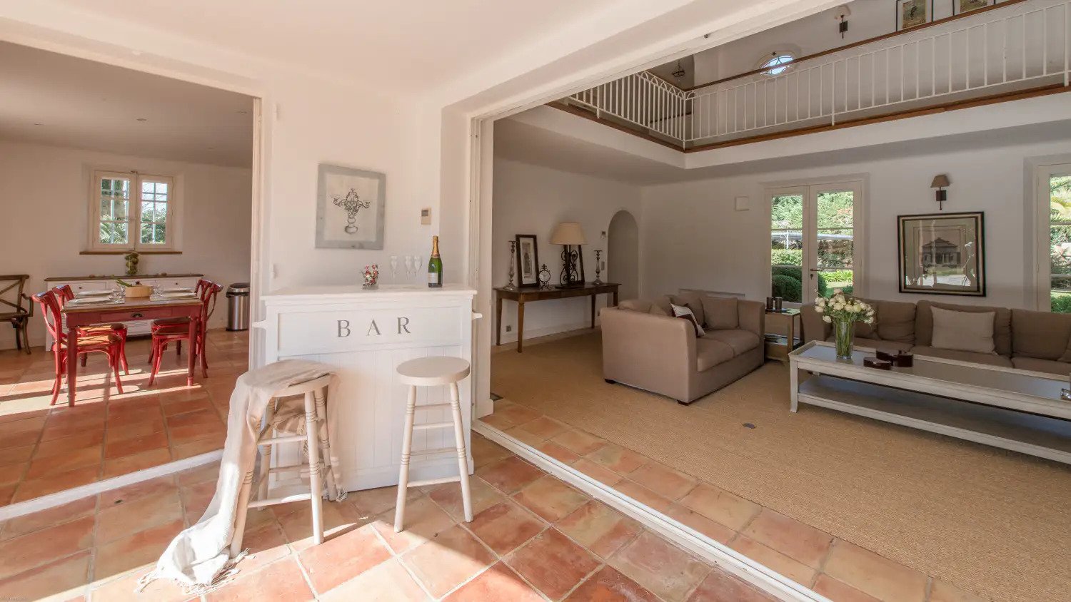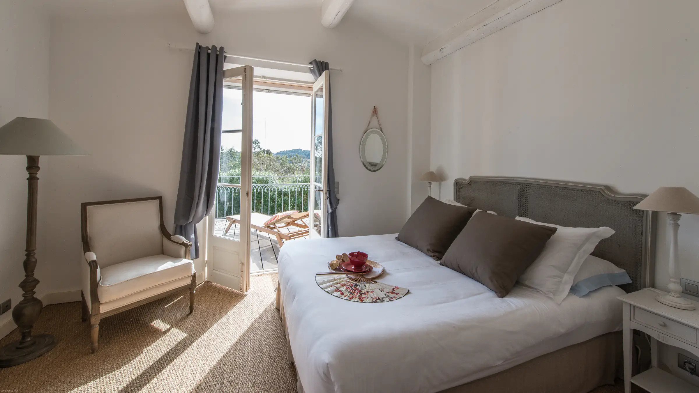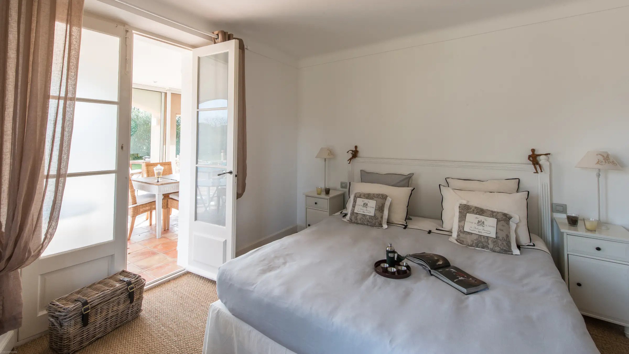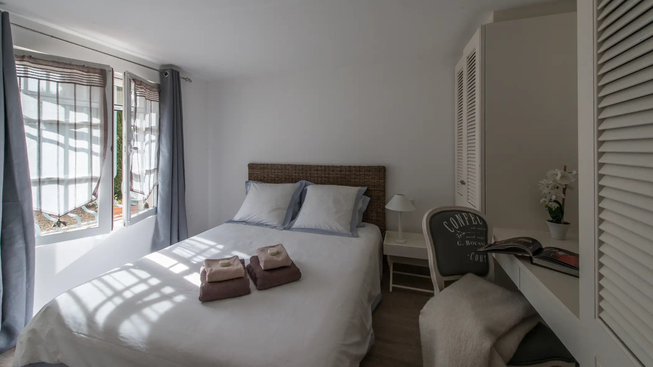 Villa Jordyn’s left-wing offers an autonomous apartment including a kitchen, seating room, and two bedrooms with a shared bathroom.  Also, there is a staff apartment with one bedroom and a shower room. The rooms are light, airy, and welcoming, with nods to the south of France’s traditional style.