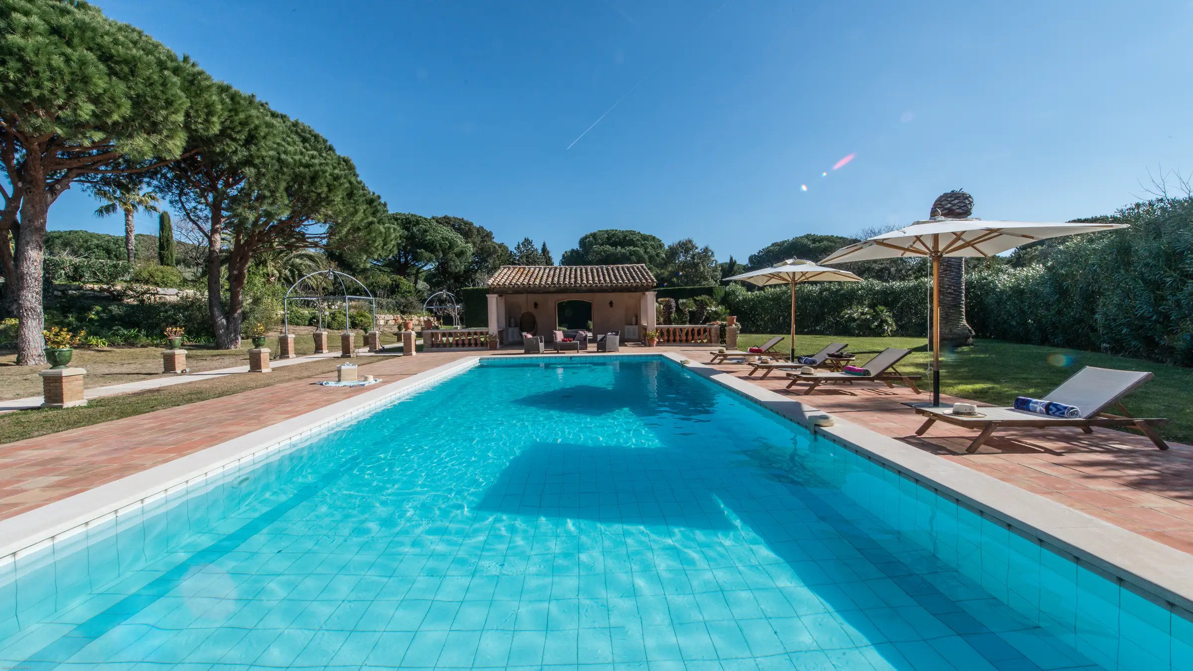 This elegant luxury villa located in the exclusive domain Les Parcs Saint Tropez is sure to capture your heart and imagination with its slew of luxe features.