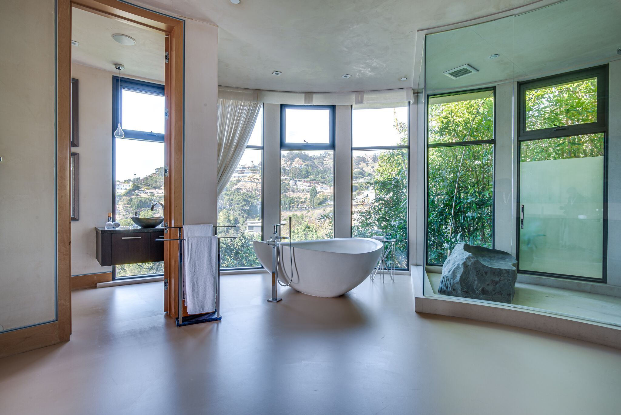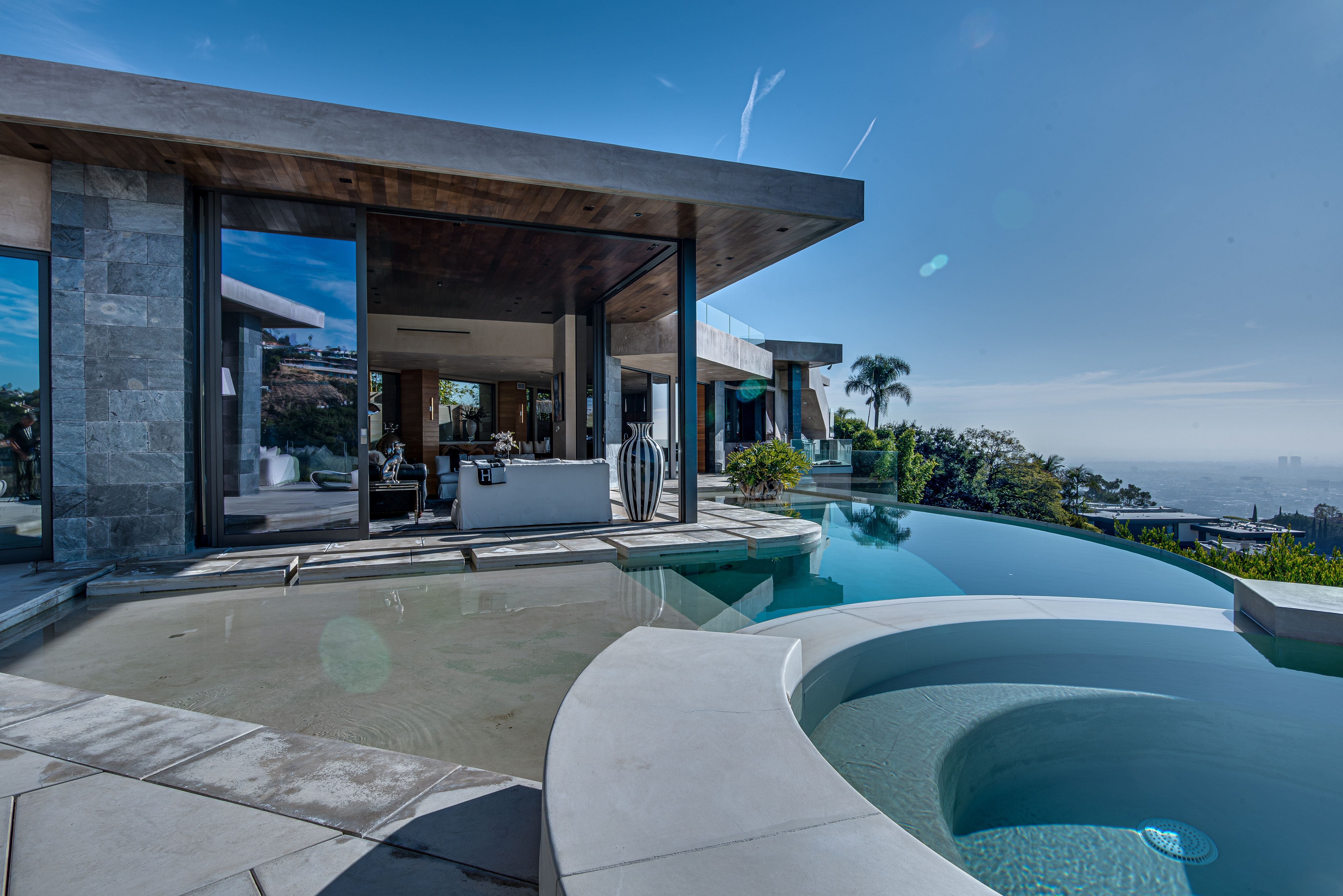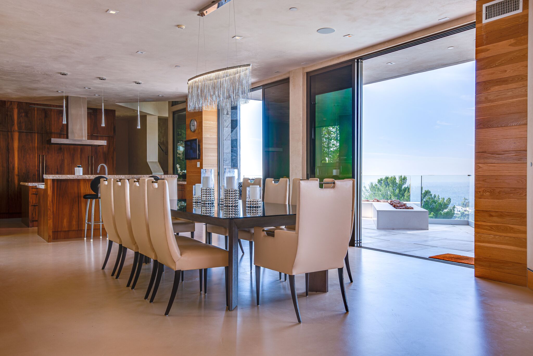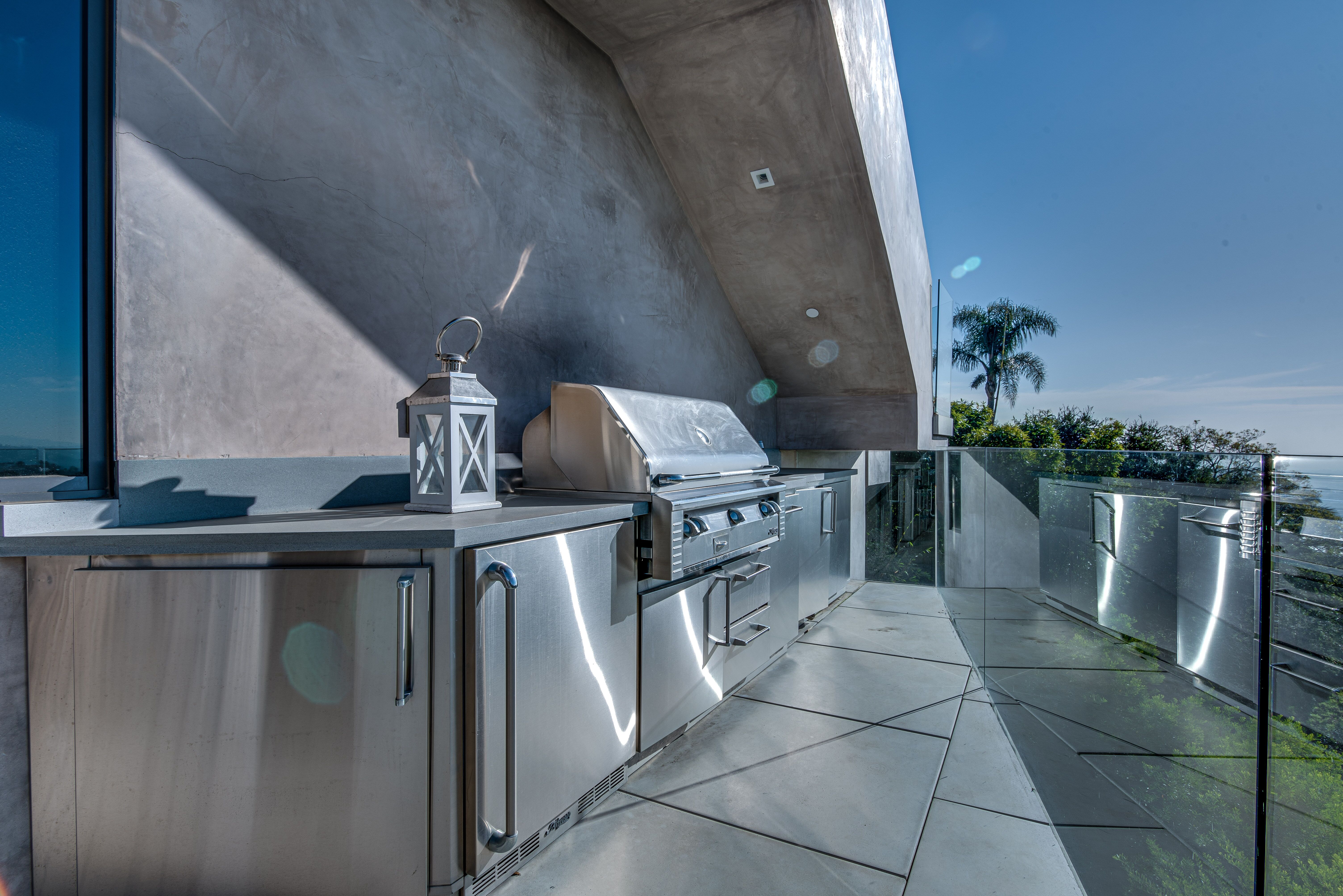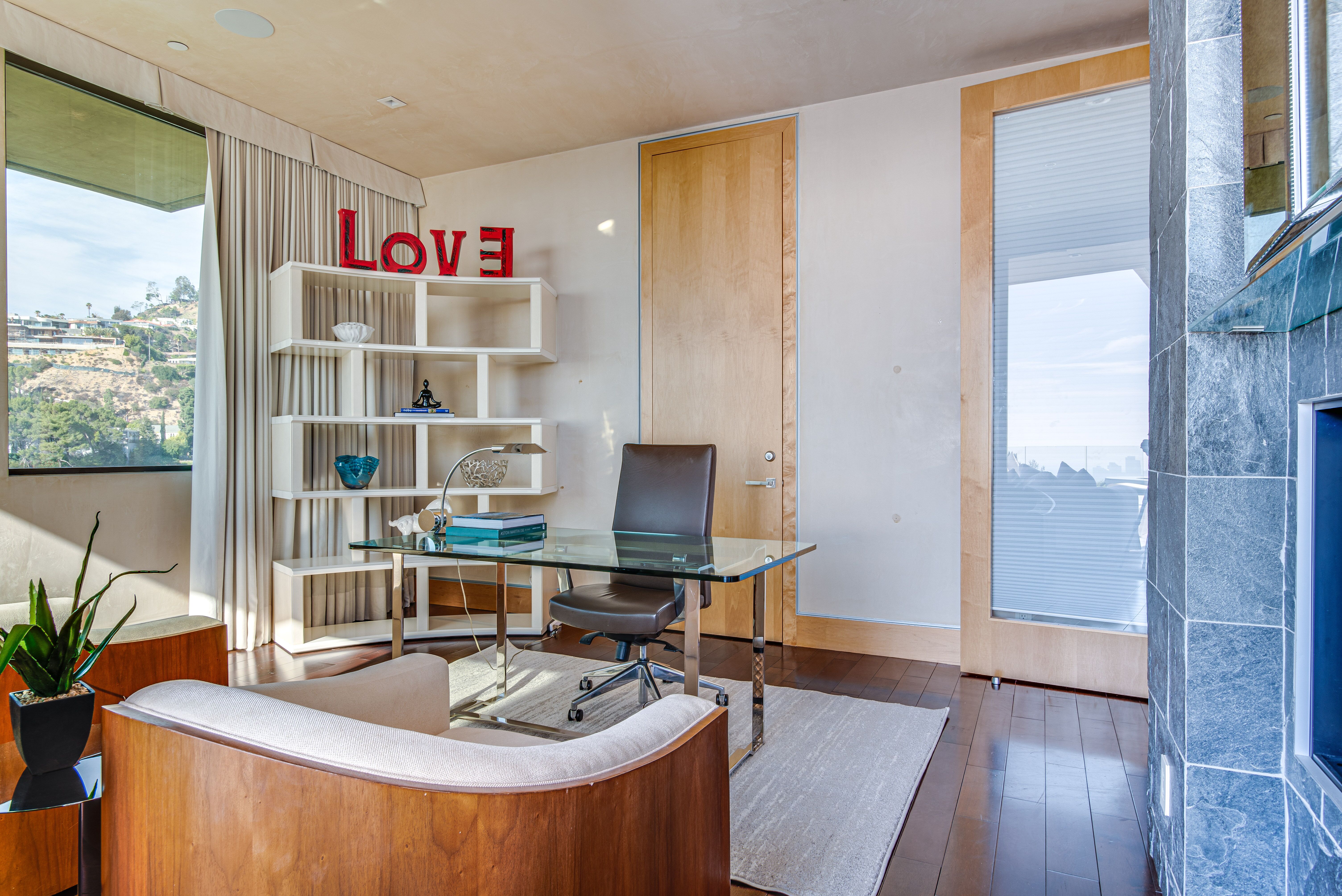 The property oozes modern contemporary style, with huge glass windows that make the most of LA’s legendary sunshine. They also allow you to enjoy stunning views over Los Angeles. These views are also on full display in the manicured grounds, which also feature a sparkling swimming pool, hot tub, and firepit. It really is an entertainer’s delight.