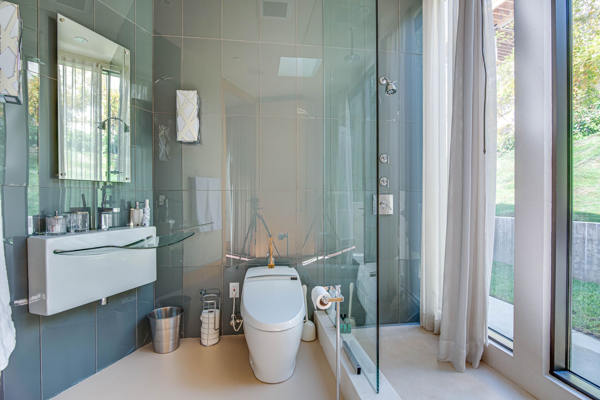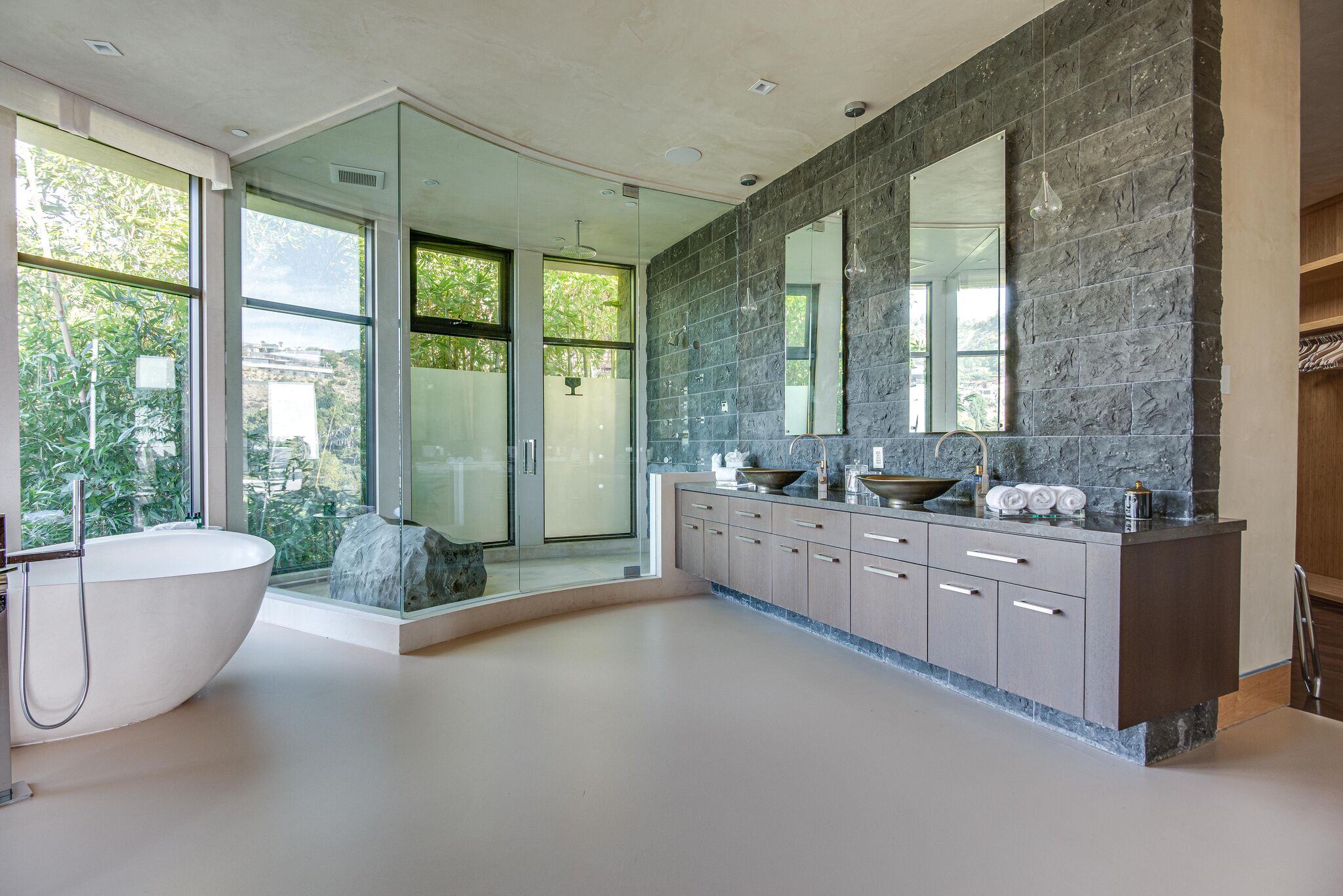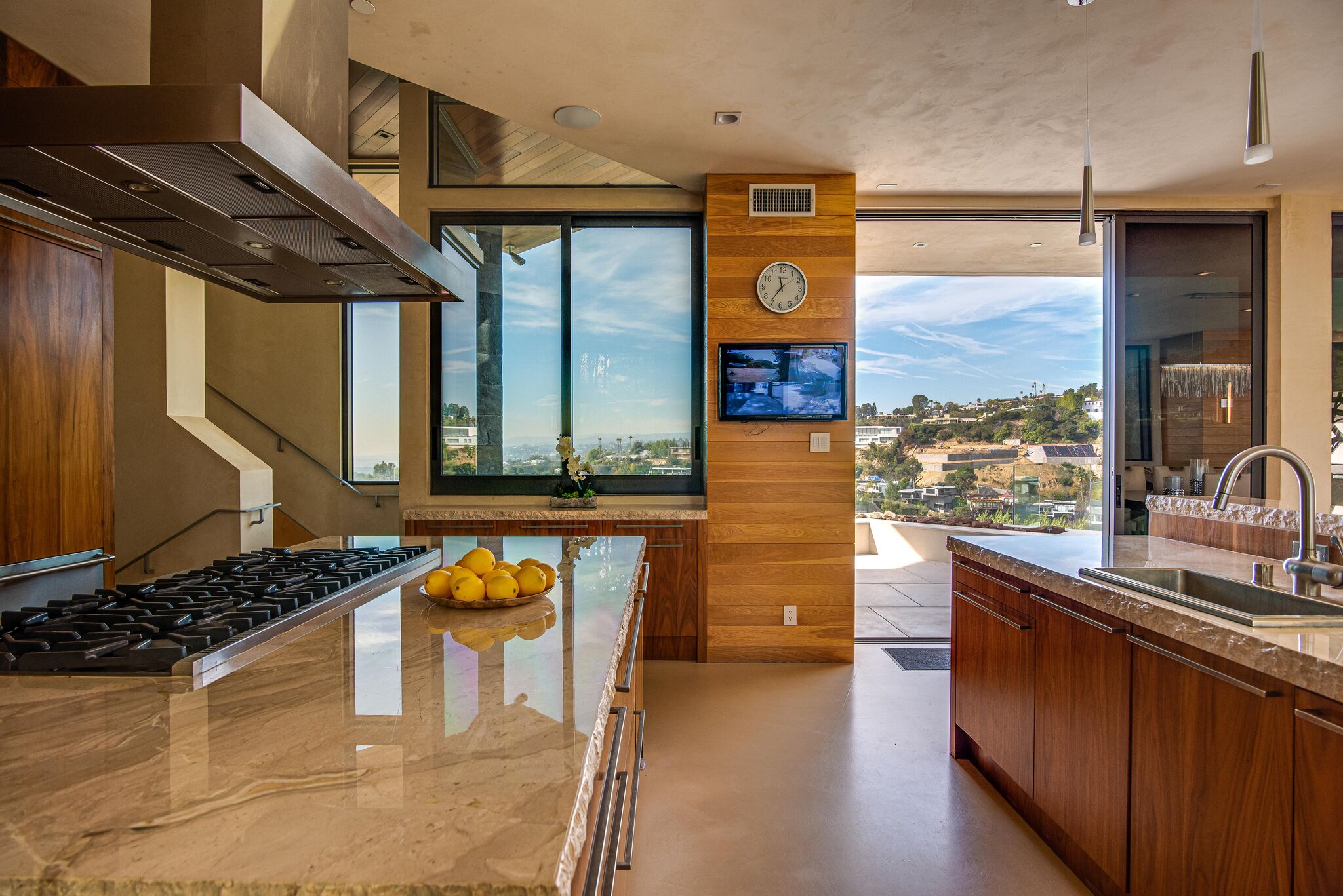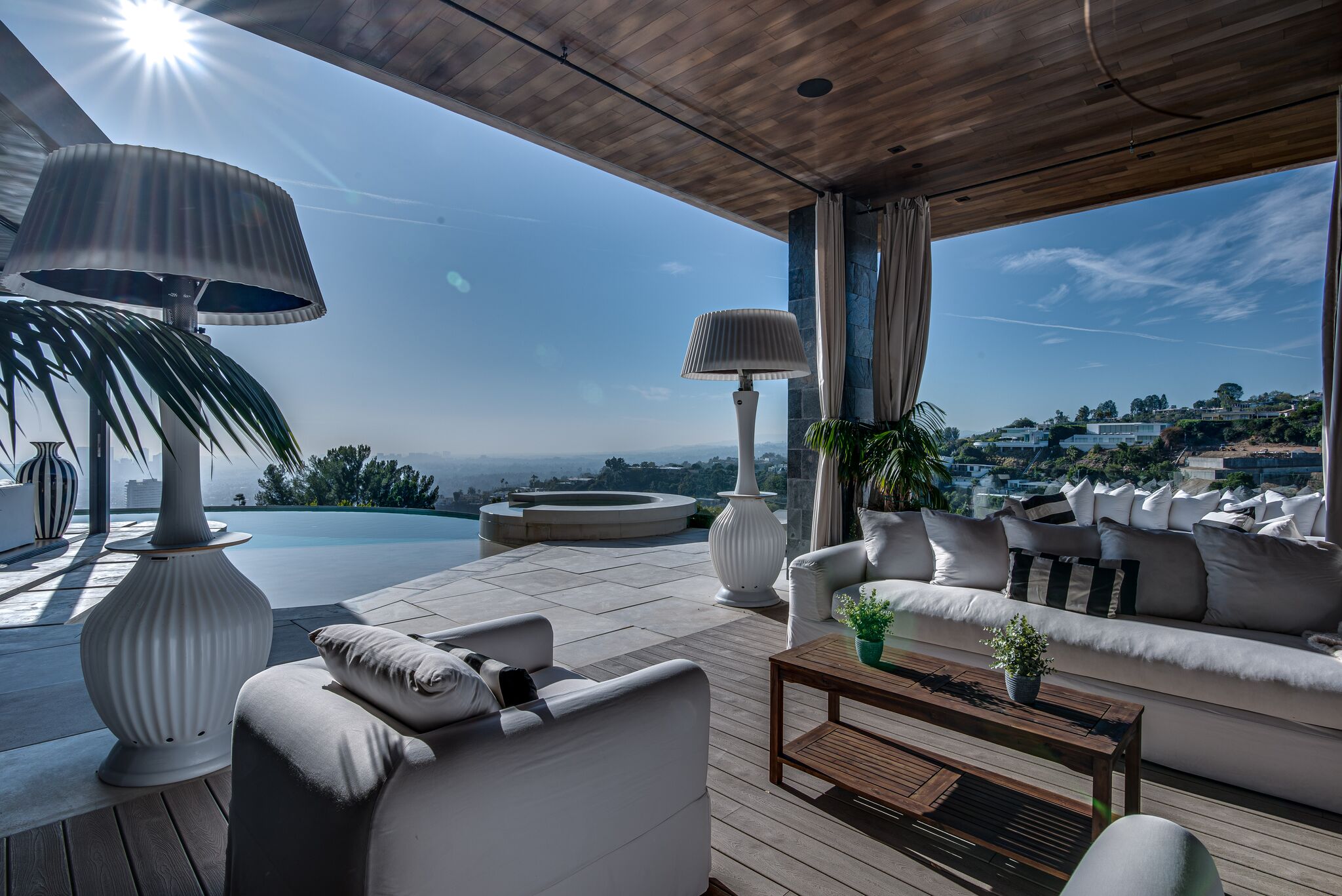 The property oozes modern contemporary style, with huge glass windows that make the most of LA’s legendary sunshine. They also allow you to enjoy stunning views over Los Angeles. These views are also on full display in the manicured grounds, which also feature a sparkling swimming pool, hot tub, and firepit. It really is an entertainer’s delight.