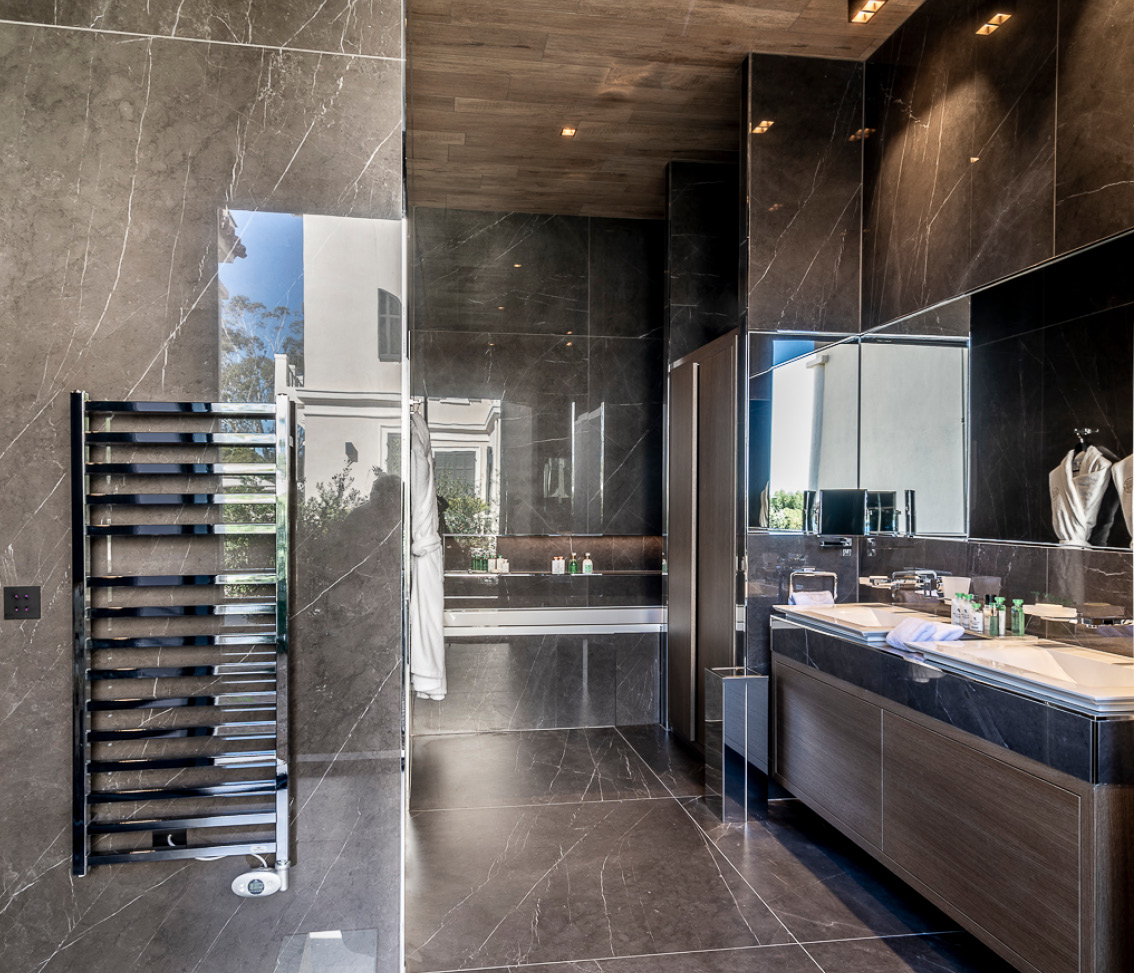 Outside, the beautifully landscaped grounds measure 1,000m2 and feature manicured lawns and palm trees. Here you can enjoy the large, heated swimming pool, jacuzzi, and multiple relaxation areas.