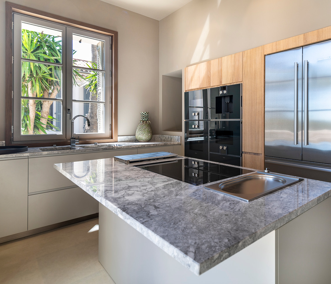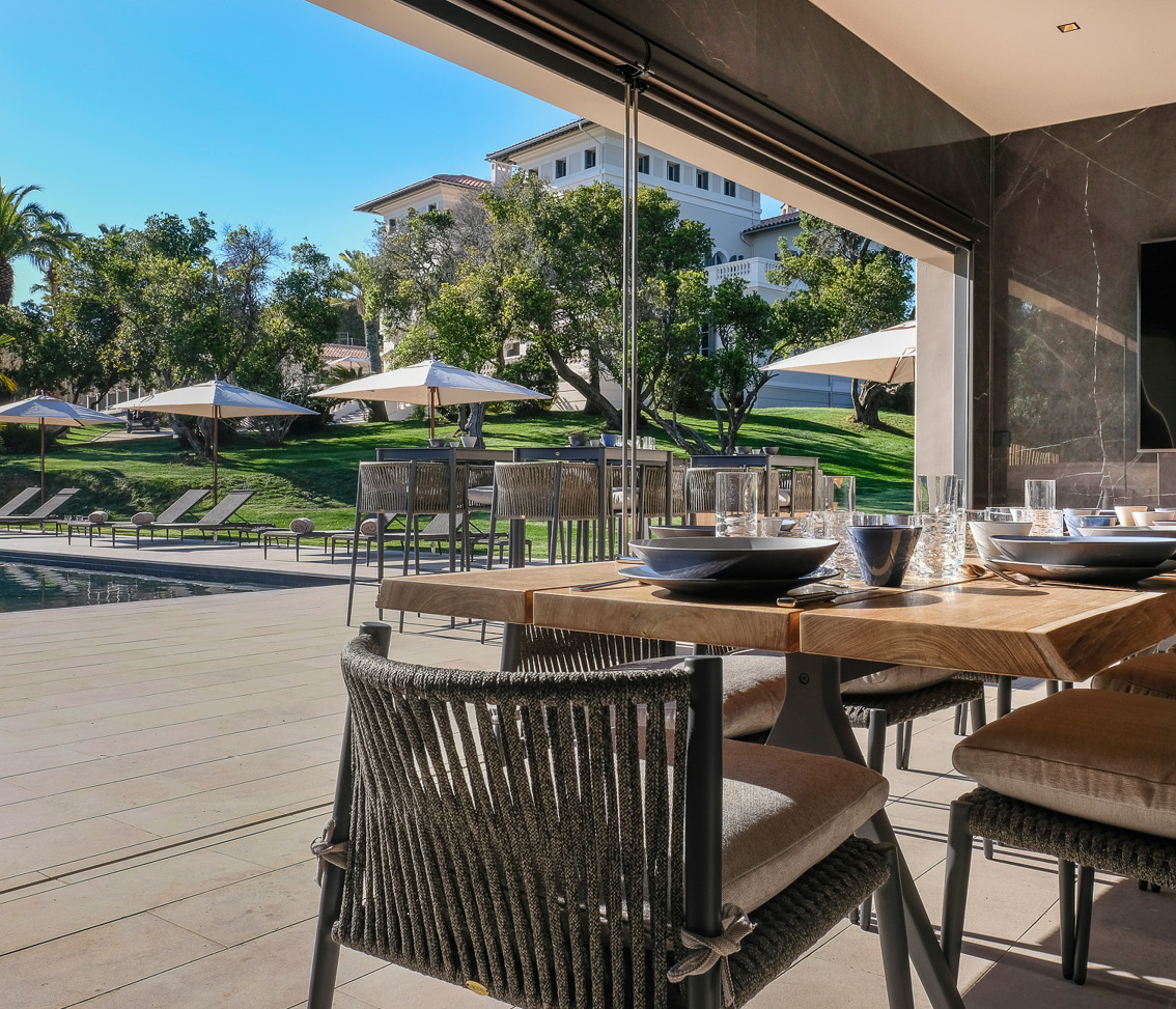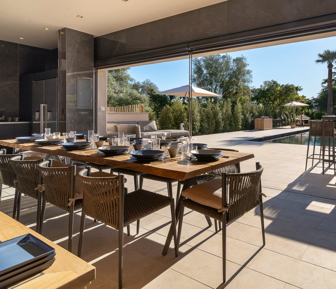 The primary residence contains a family kitchen and a service kitchen. The large dining and living room are the ideal setting for local delicacies, as is the exterior dining area. Here you also will find five of the villa’s beautiful ensuite bedrooms.