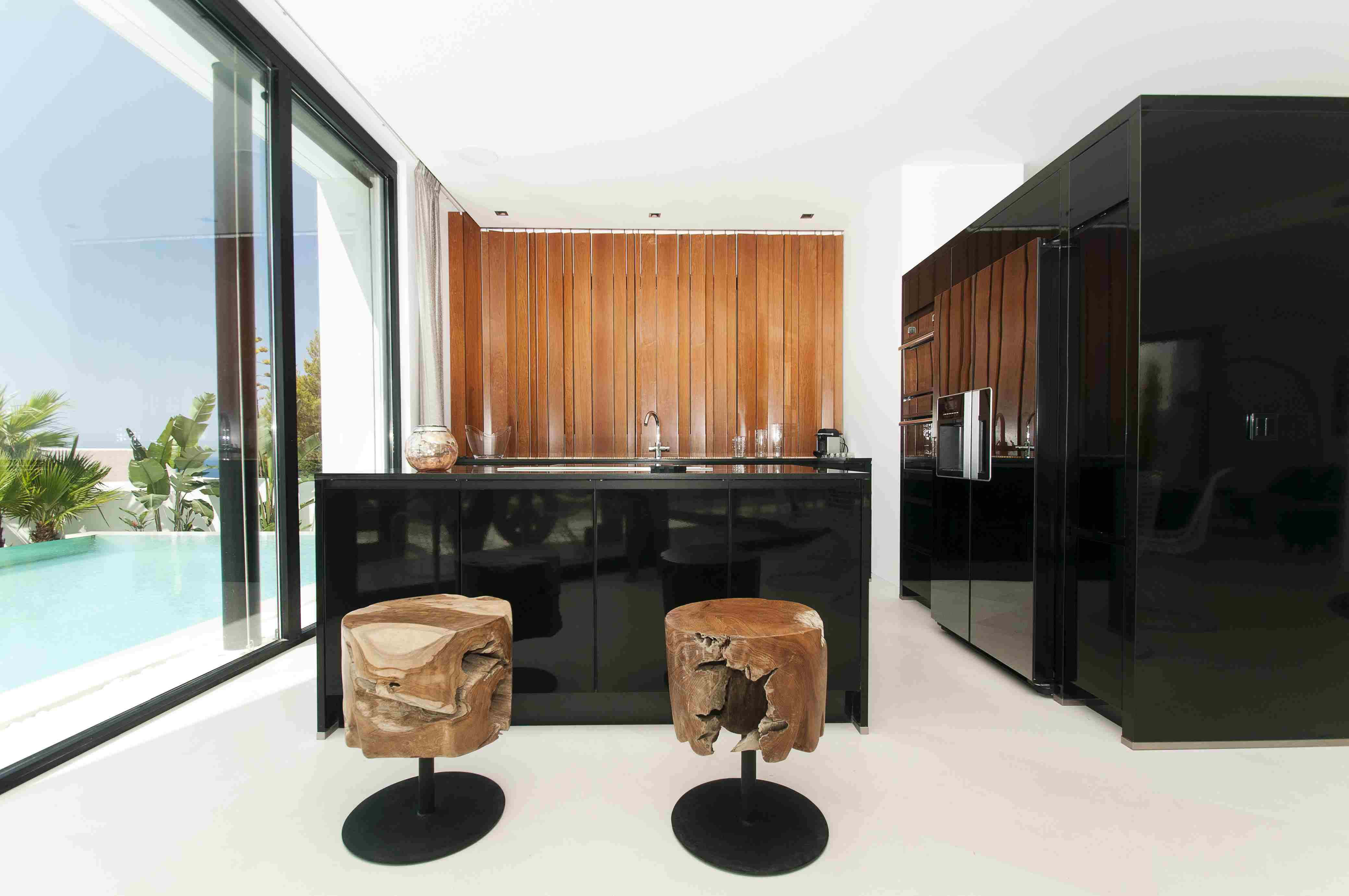 Inside, the décor and design are stylish and tranquil. Although unique and handpicked art pieces add interest and color to the villa. Large windows also add to the light and airy feel. Several shared living spaces include a stylish lounge and a well-equipped kitchen with high-end appliances. There is also an office space in case you need to do any work.