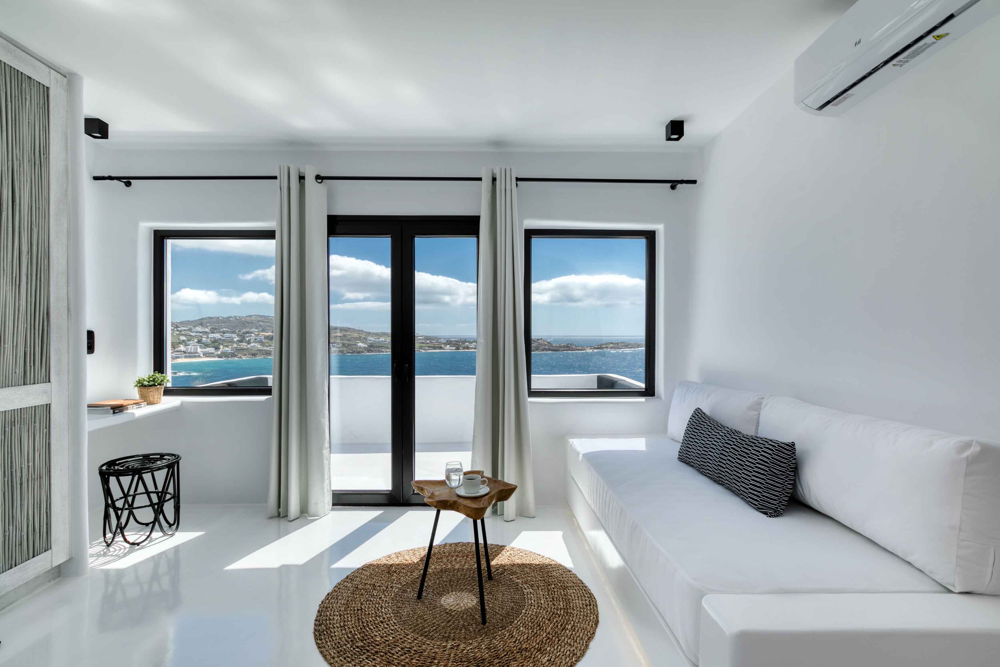 Outside, the dazzling infinity pool overlooks the ocean. Another highlight is the indulgent Jacuzzi. Just a short walk along your private pathway leads you to a charming beach. And Psarou Beach is just a short drive away. Likewise, the bustling Mykonos Town is just a few kilometers away, offering a plethora of shopping and dining options.