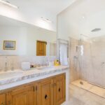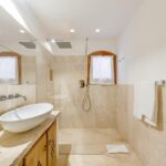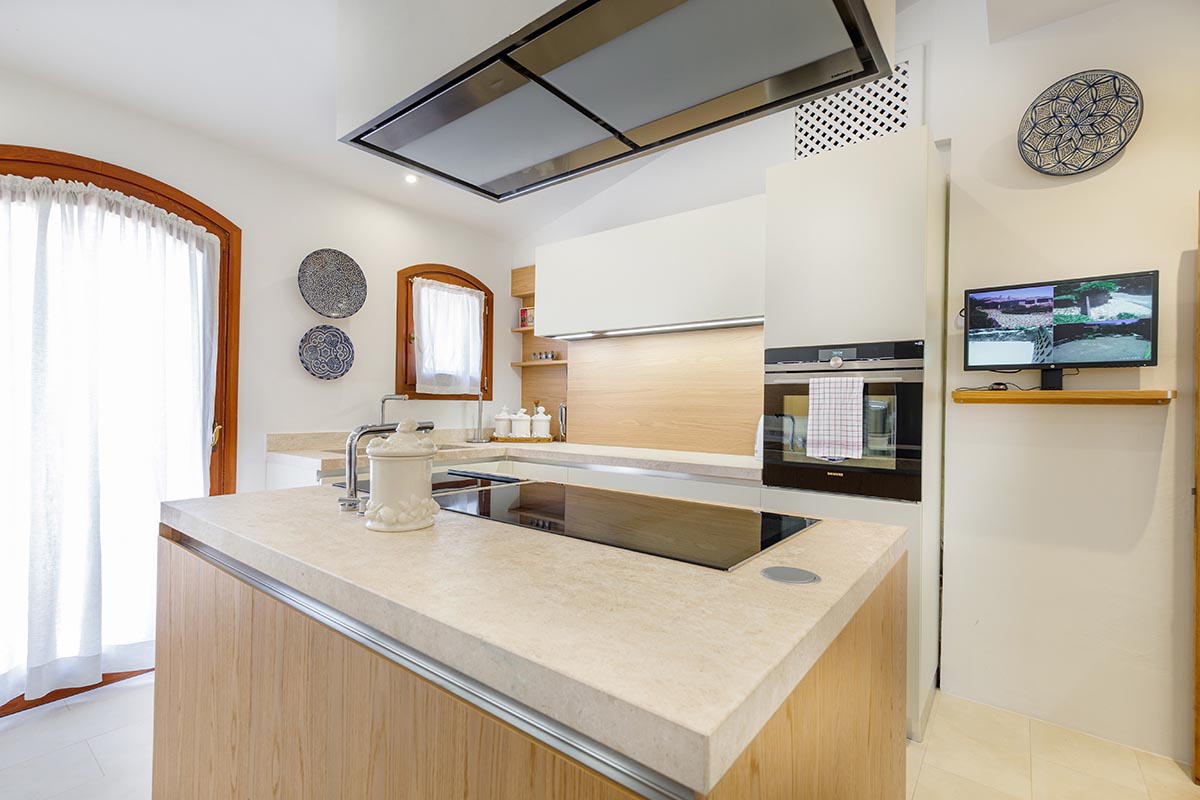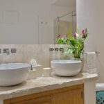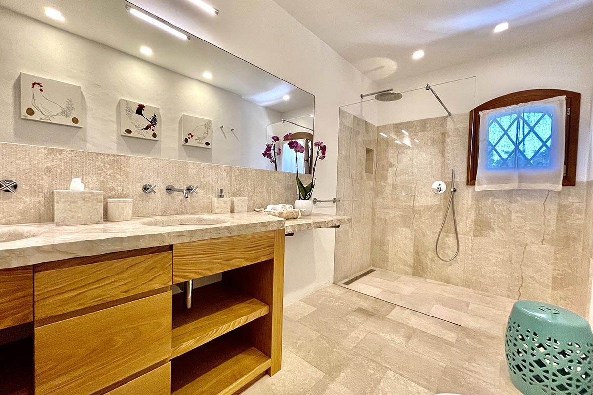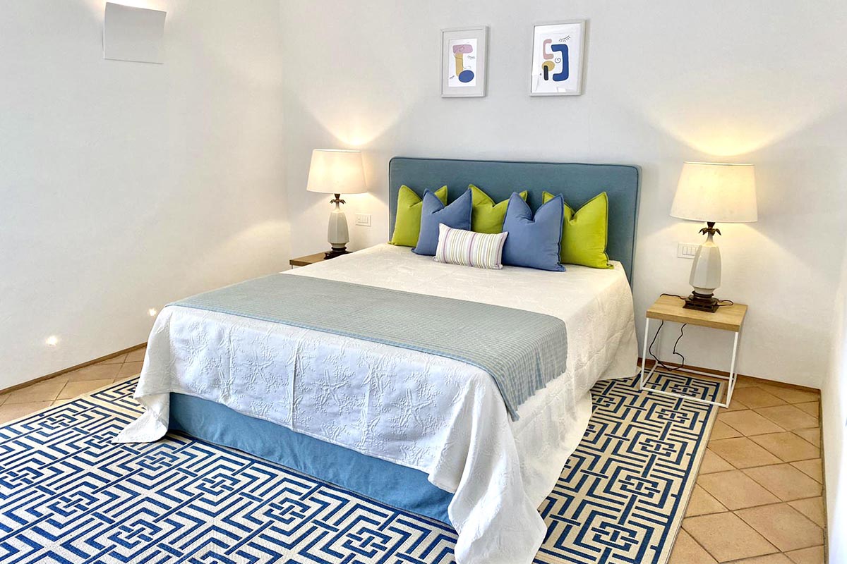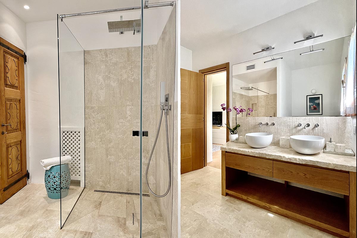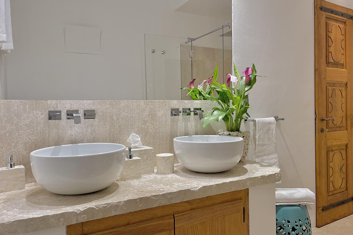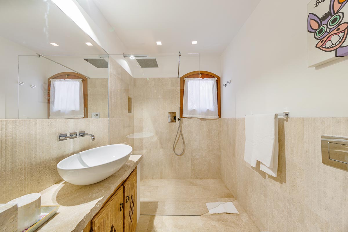 The villa can sleep 12 overnight guests. The sleeping area consists of two double bedrooms and one single on the ground floor, each with its bathroom, while on the lower floor, we have two double suites with a bathroom. With single access from the garden, two further double suites with bathroom, and two rooms for the staff.