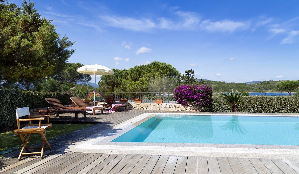 A teak patio, including Sunbrellass and deck chairs, surround the inviting Seaview swimming pool.